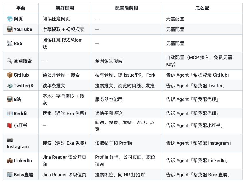 我最近发现的Agent Reach项目(GitHub开源仅2天即获1.1K+ Star)提供了一个出人意料的解决思路——通过统一的脚手架架构,将多平台网络接入能力标准化和模块化,使得集成工作从"半天折腾"简化到"一句话安装"。