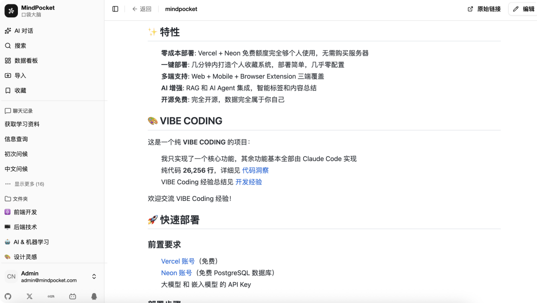 MindPocket的切入点就在这里:它不是又一个书签管理工具,而是通过AI技术为收藏内容赋予检索能力和知识关联能力。