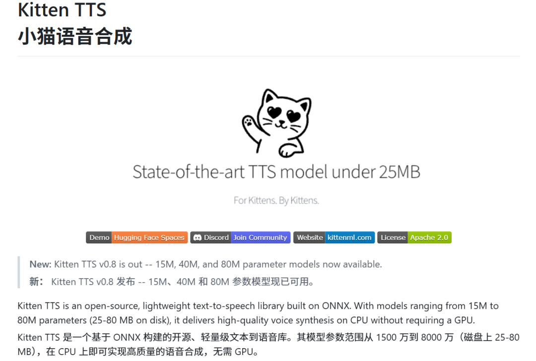今天要介绍的KittenTTS,正是在这样的背景下诞生的一个有趣的开源项目。