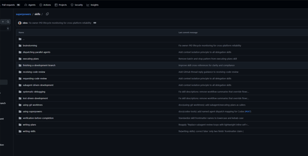 Superpowers 包含 17 个可组合的技能模块,覆盖开发周期的各个阶段: