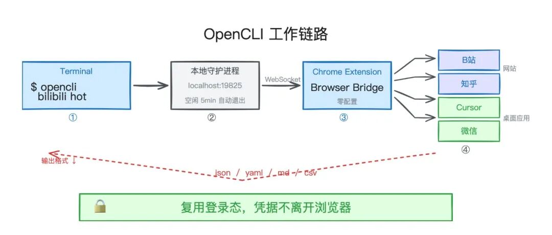 OpenCLI 有一个设计要点:复用 Chrome 中已有的登录态。