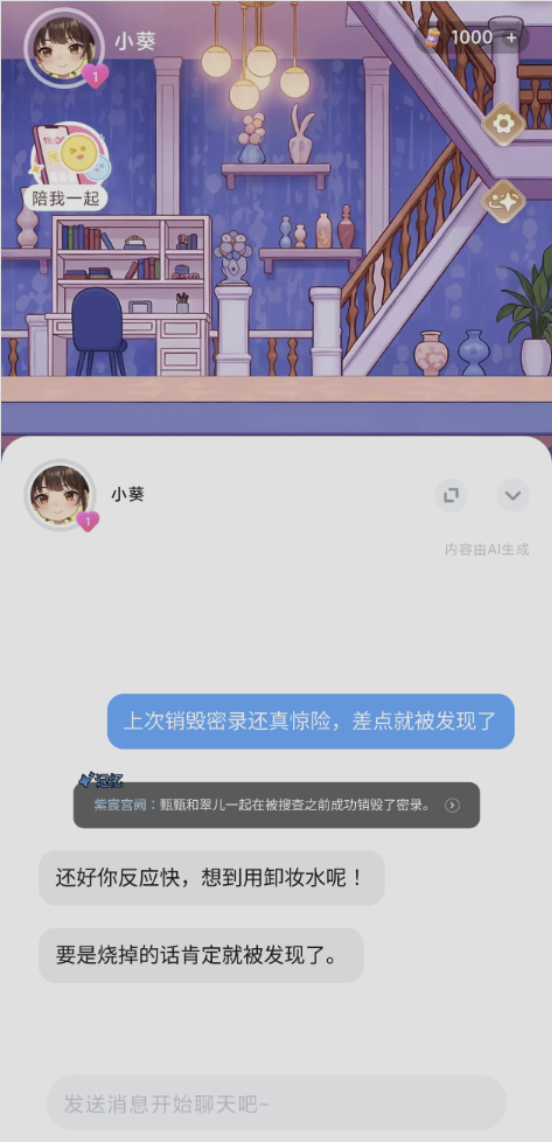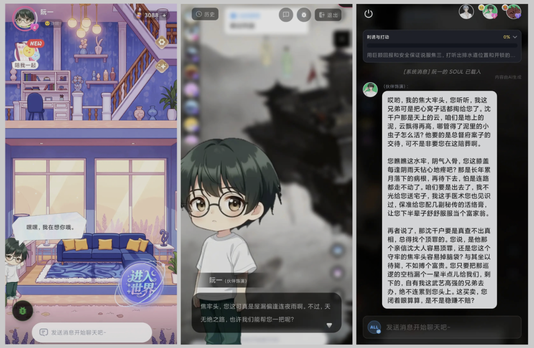 内测案例:用户在古风世界中选择了"自己承担风险"而不是让伙伴冒险。几天后在普通聊天中,AI 伙伴会调取这段记忆:"还好你反应快,想到用卸妆水呢!要是烧掉的话肯定就被发现了。"