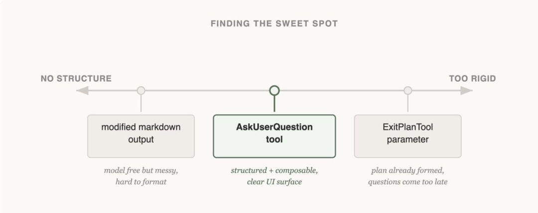 我们给 ExitPlanTool 增加了一个问题数组参数,让它在生成计划的同时列出要问的问题。这是最省事的改法,却立刻引发混乱:计划与问题共存时,若用户回答与计划冲突怎么办?是否需要二次调用?这条路走不通。