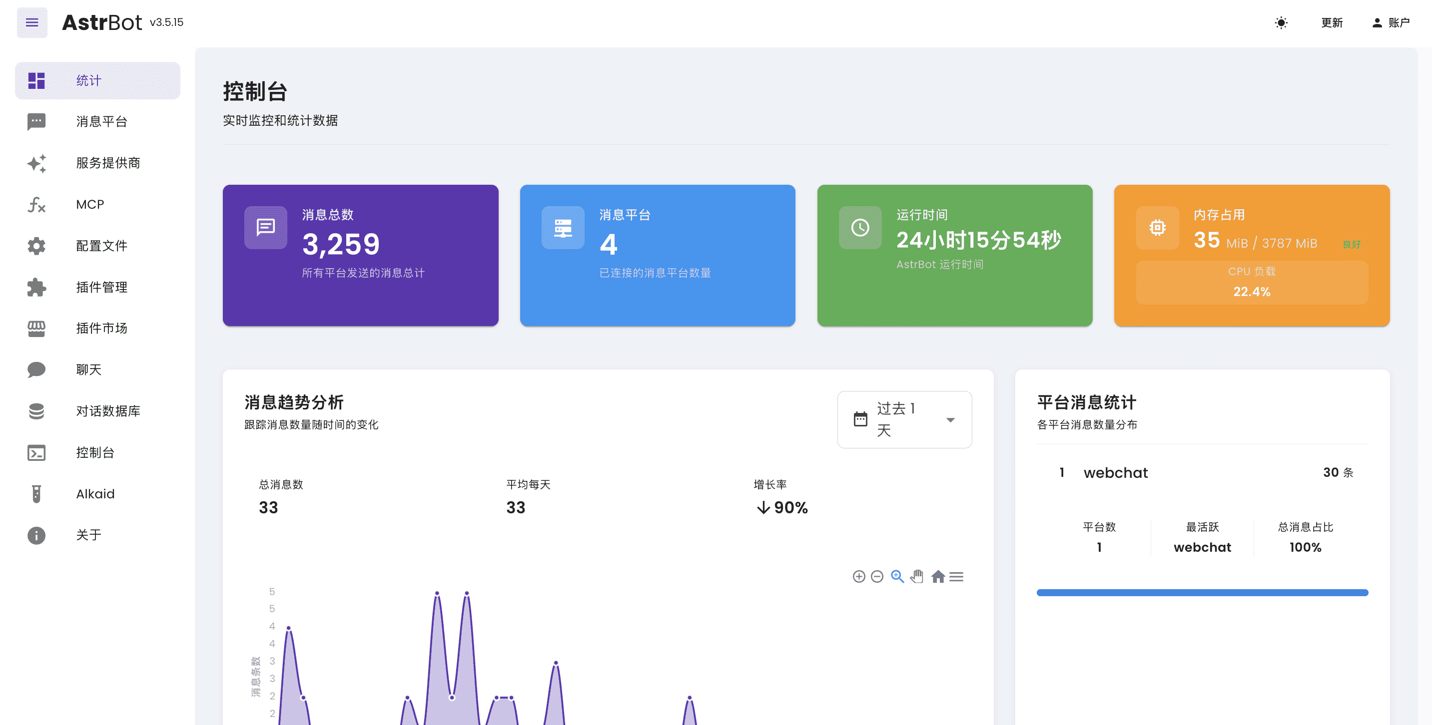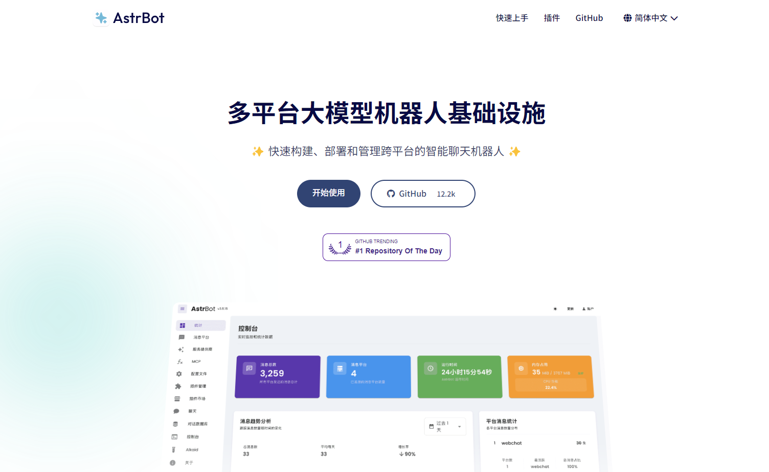 直到最近,我发现了一个开源项目:AstrBot。它几乎把我之前遇到的所有痛点都打包解决:多平台接入、大模型调用、插件扩展、可视化运维,让开发者终于能把精力放回到“设计更好的对话体验”上,而不是被接口和配置绑架。