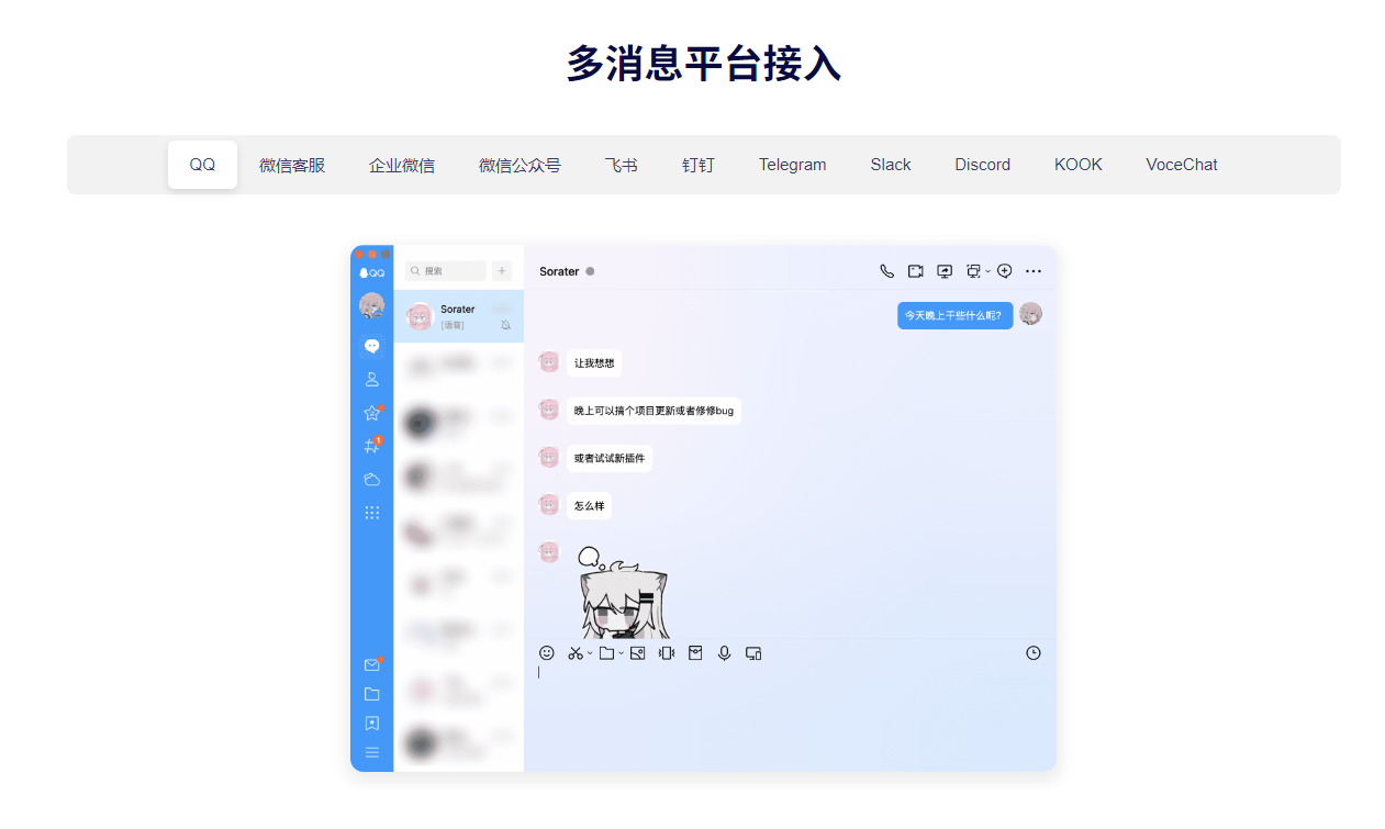 已适配 QQ(OneBot / 官方机器人)、微信(Gewechat)、飞书、钉钉、企业微信、Telegram、Discord、KOOK、VoceChat 等。