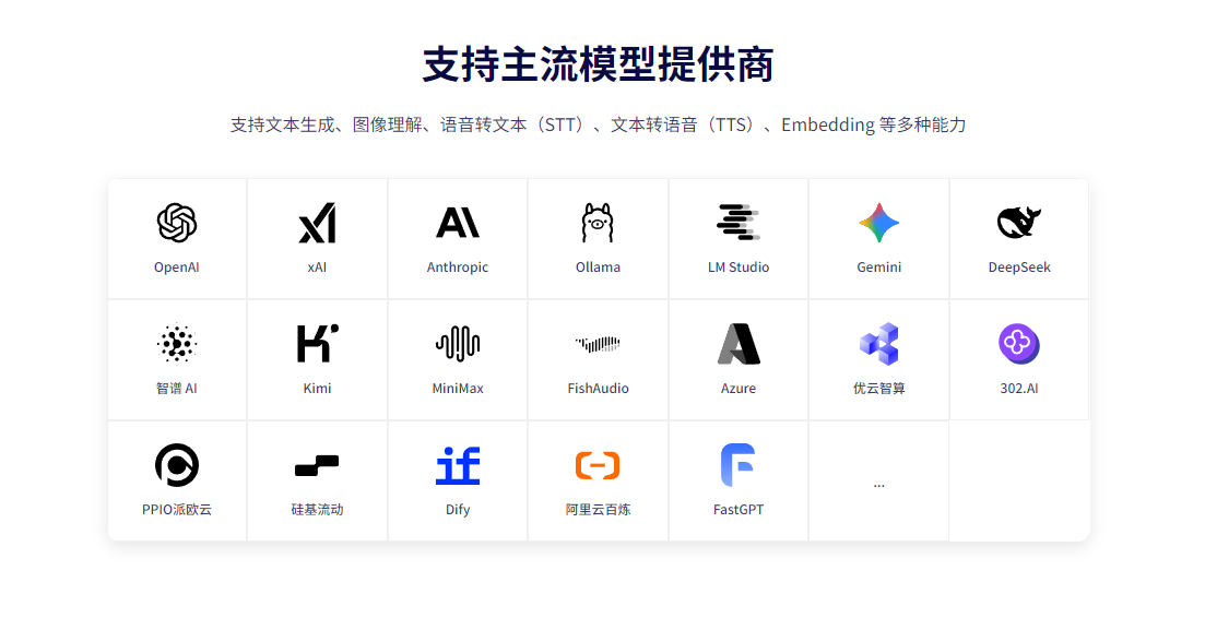 支持 OpenAI、Llama、DeepSeek、通义千问等大模型。