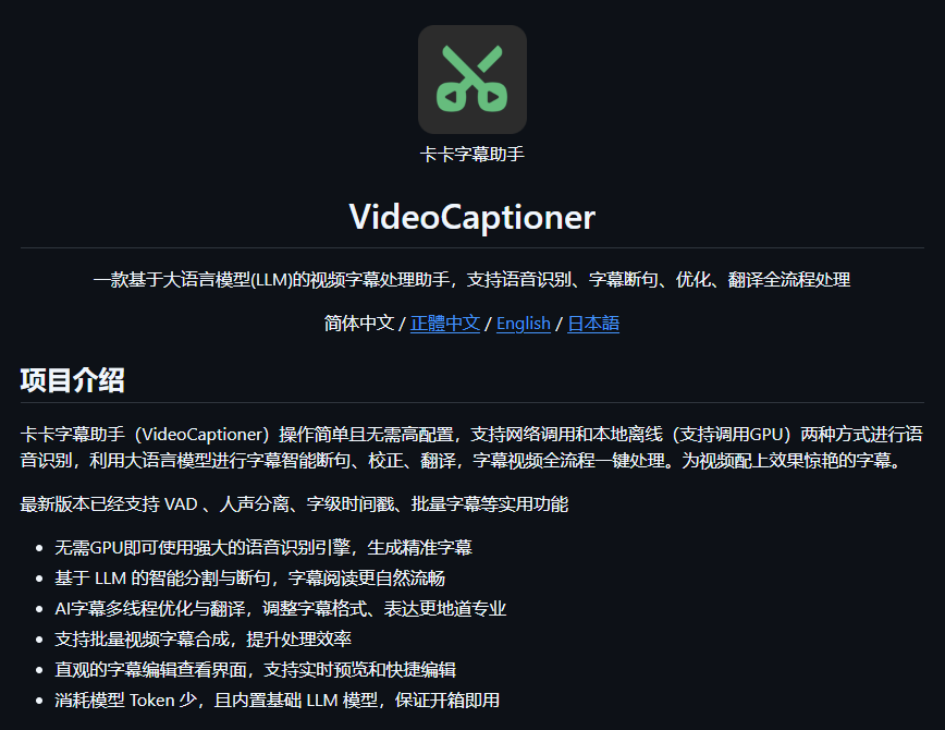 项目地址:https://github.com/WEIFENG2333/VideoCaptioner