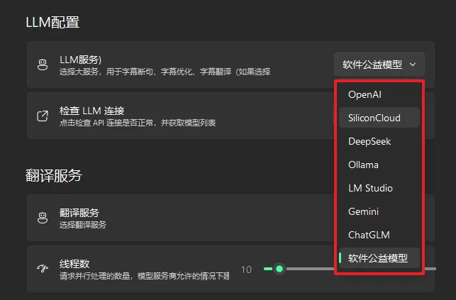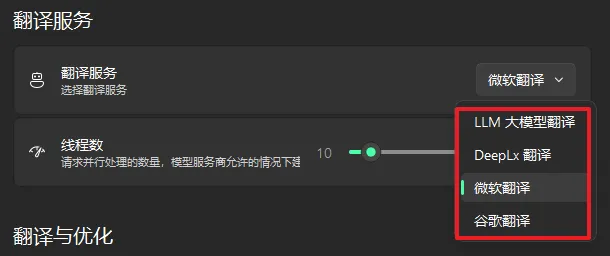 内置多种翻译方式,可以调用 LLM(OpenAI、DeepSeek、Gemini、GLM、硅基流动、本地 Ollama 等)