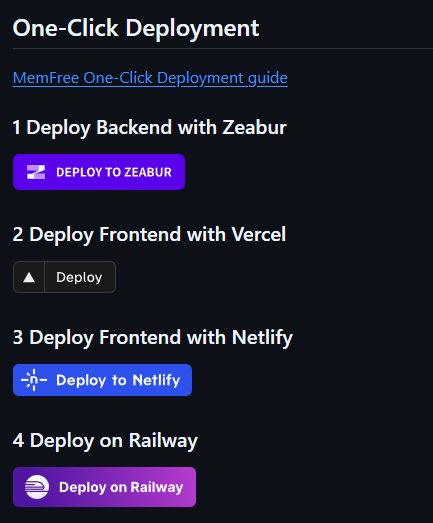 MemFree 还提供了Vercel、Railway等一键部署按钮,帮助用户快速部署至云平台,支持零配置 CI/CD。