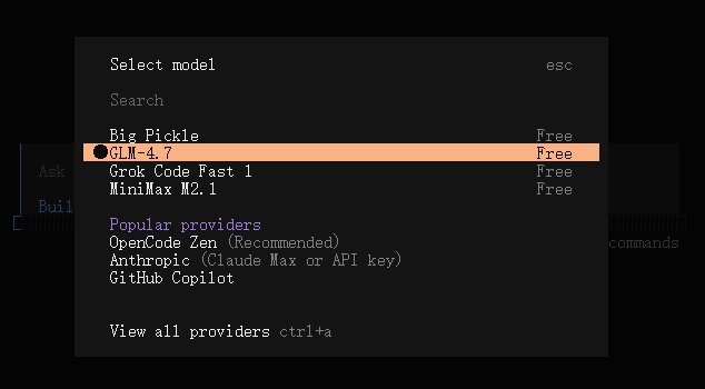 输入 /model,可以看到一批免费模型,比如 GLM-4.7。