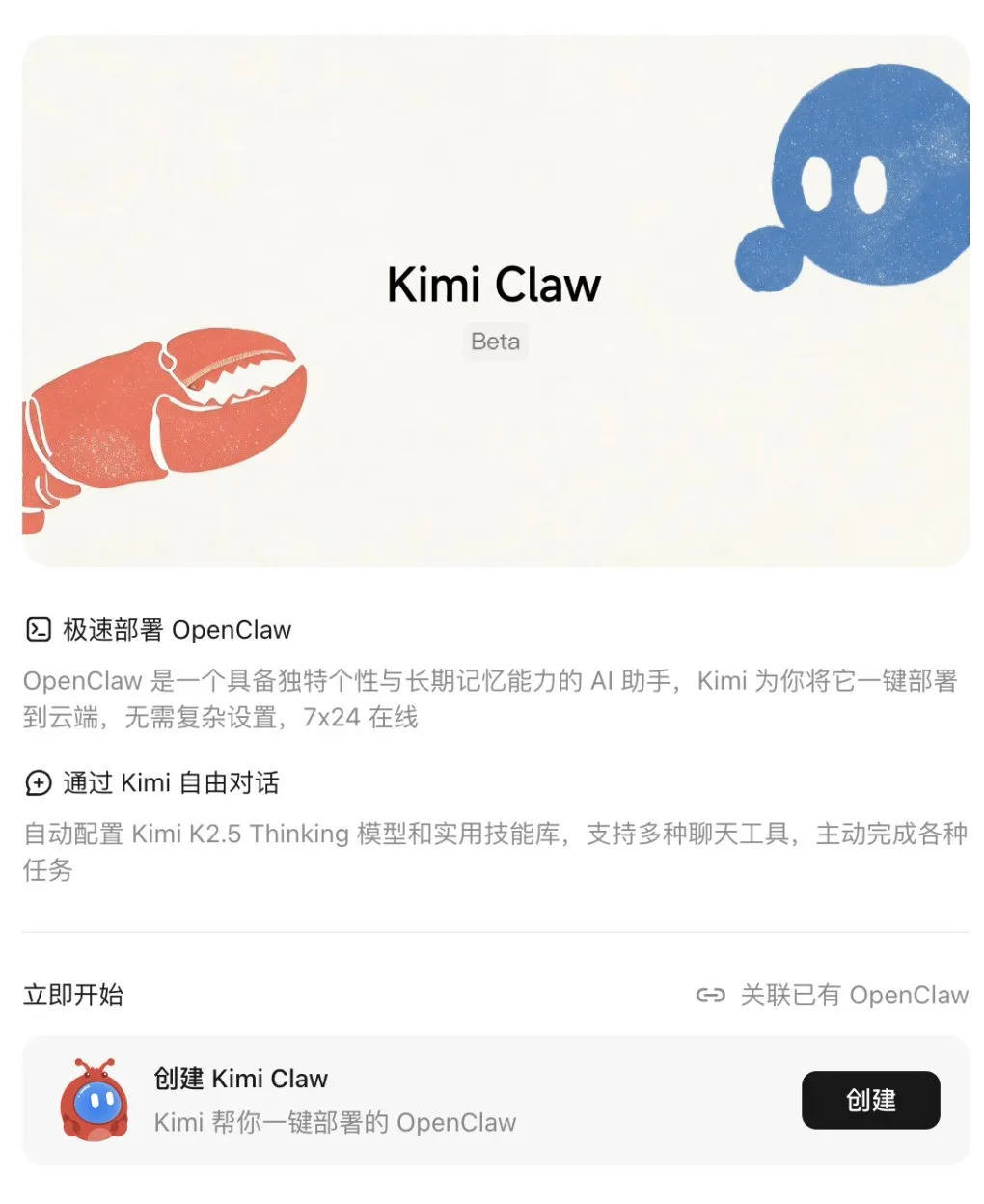一步创建:打开链接,点击「创建」,大约 1 分钟就能拿到你的 Kimi Claw。