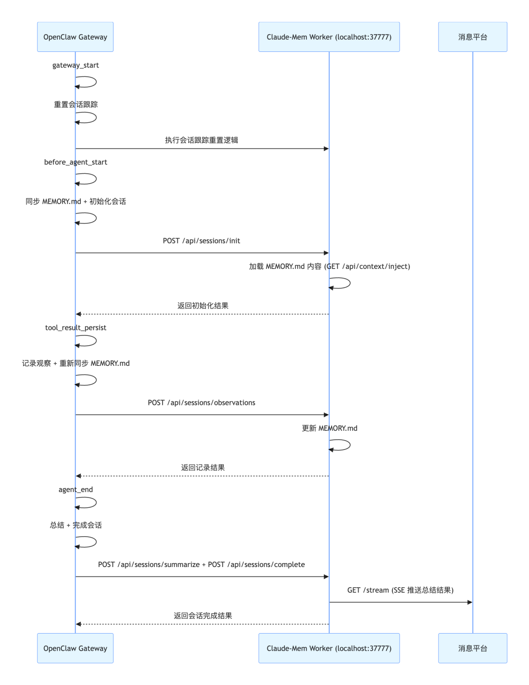 - 事件 3:tool_result_persist(工具结果持久化) — 捕获工具调用及返回;把观察发送到 Claude-Mem Worker 做 AI 处理;再次同步 MEMORY.md,保证上下文即时更新。