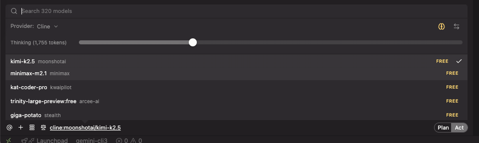 在 API Provider 选择「Cline」,Model 切到「Free」,即可看到可用免费模型