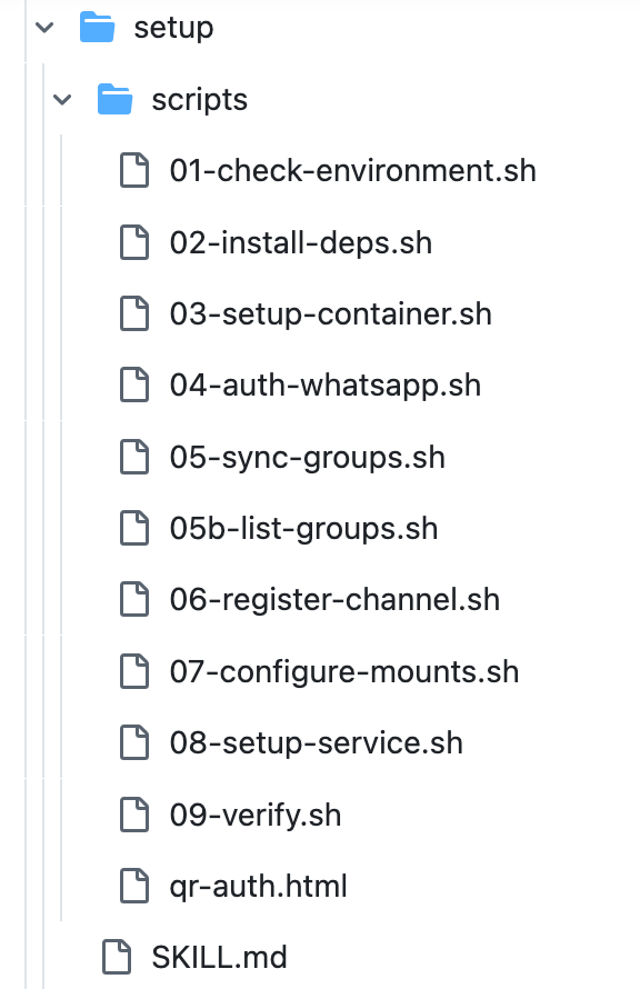 安装逻辑被单独抽到 setup 目录:平台检测、环境配置、容器构建、服务注册各自成模块,职责清晰。我正好赶上一轮架构变更——此前安装流程用 Skills 执行,步骤写在 Markdown 里,在 Claude Code 中输入 /setup,Claude 逐步完成安装。这个“说明即安装程序”的想法很酷,但 Markdown 中混了太多逻辑,可读性一般。第二天作者就重构为 setup.sh 引导,估计也兼顾了不借助 AI 走完整流程的场景。