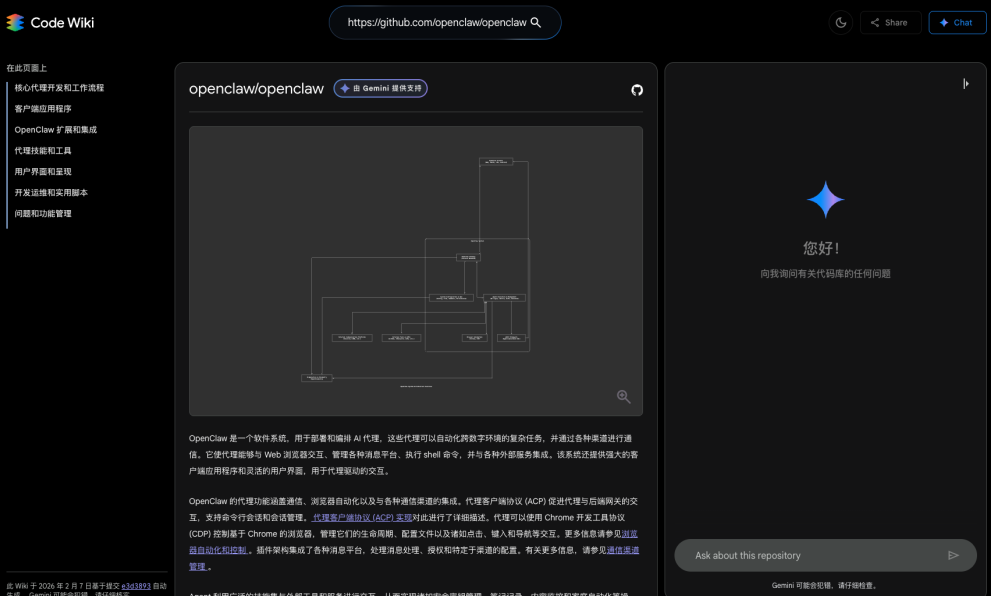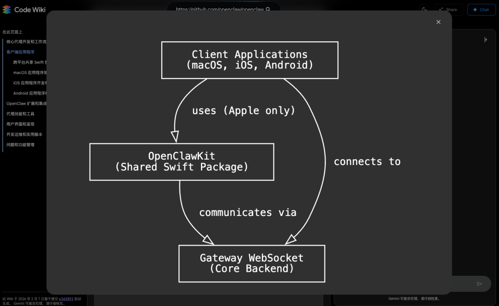 以近期爆火的 OpenClaw 项目为例:配置好 GitHub 项目后,页面会直接生成一张系统级的全景架构图;