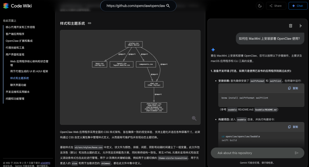 比如我问:“如何在 MacMini 上安装部署 OpenClaw 使用”,系统会给出详细步骤,并附带对应的代码引用来源,不会虚构。