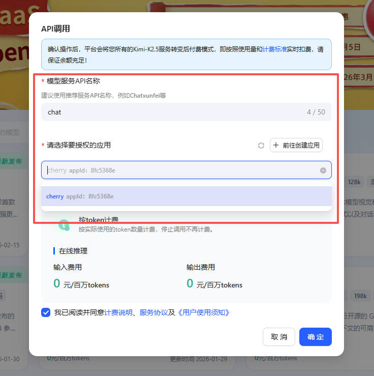挑选模型:在ModelSquare广场中找到你心仪的模型(如Kimi-K2.5、GLM-5、MiniMax-M2.5等),点击“开通API”按钮,首次使用会出现没有应用的情况,所以需要先去创建应用。