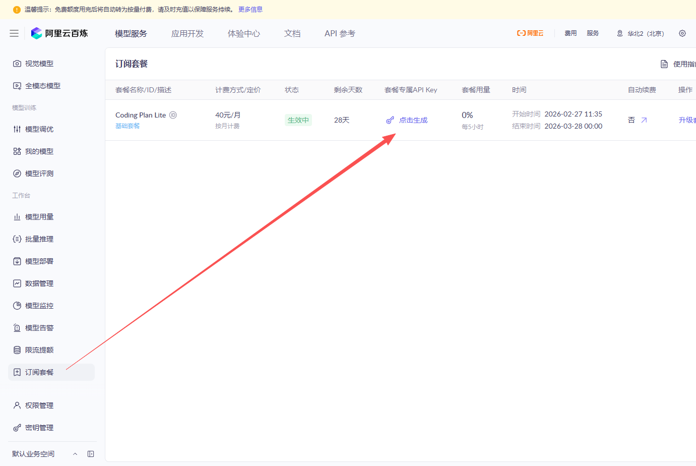 套餐开通成功后,在左侧导航栏找到 订阅套餐,点击生成 创建套餐专属 API Key。