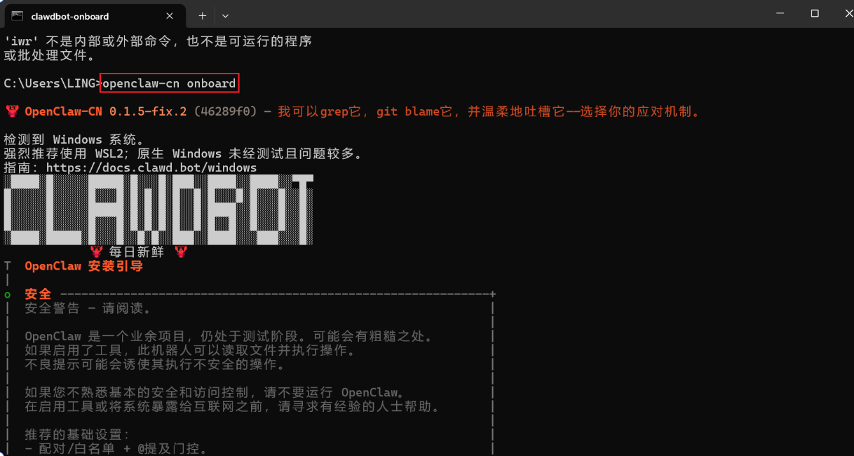 安装完成后,需通过命令行工具 openclaw-cn 进行首次初始化配置。
