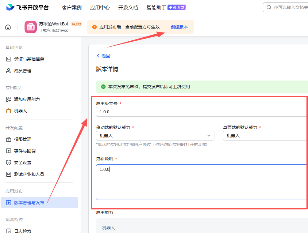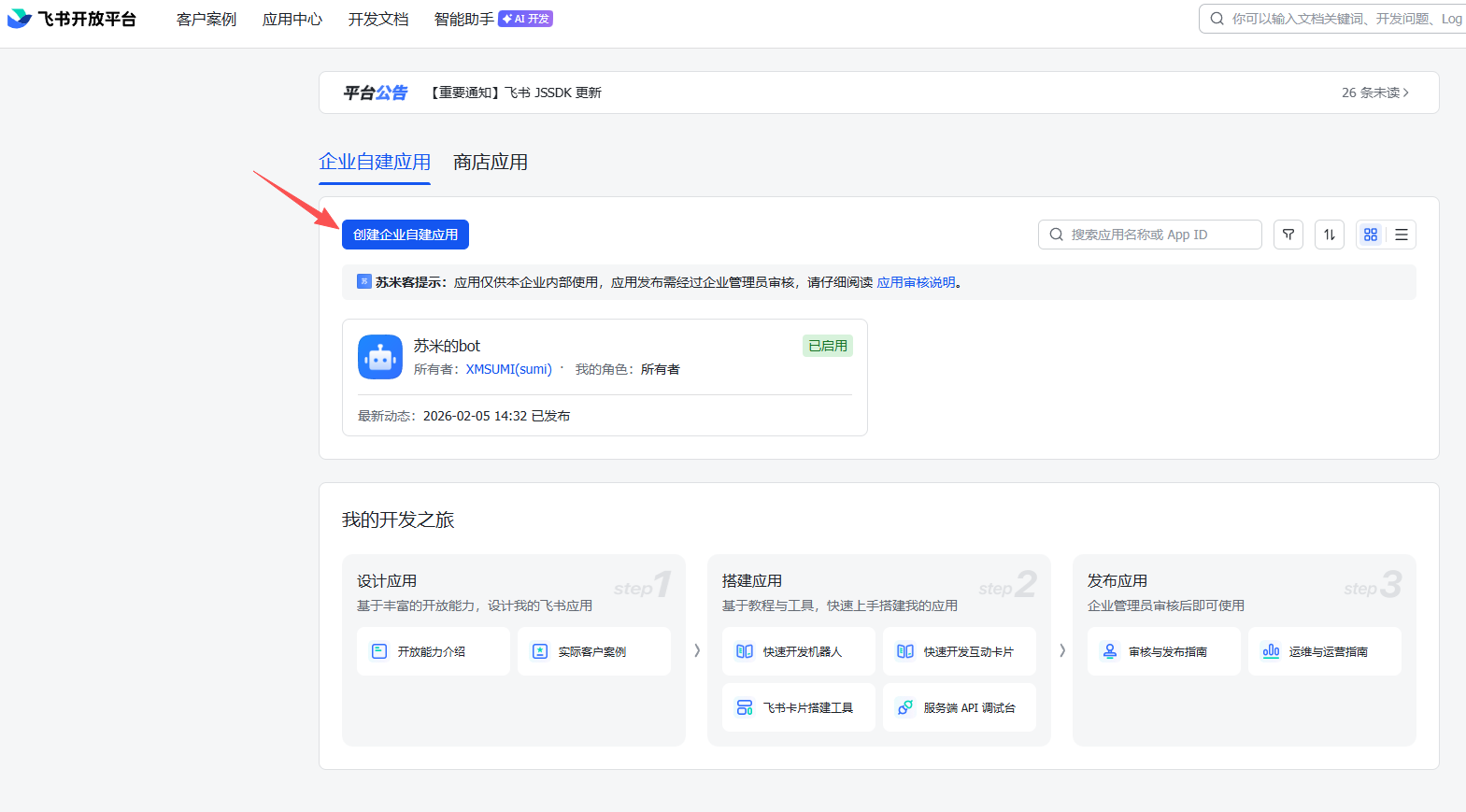 此步骤涉及飞书开放平台的应用创建与权限配置,是实现消息互通的核心。