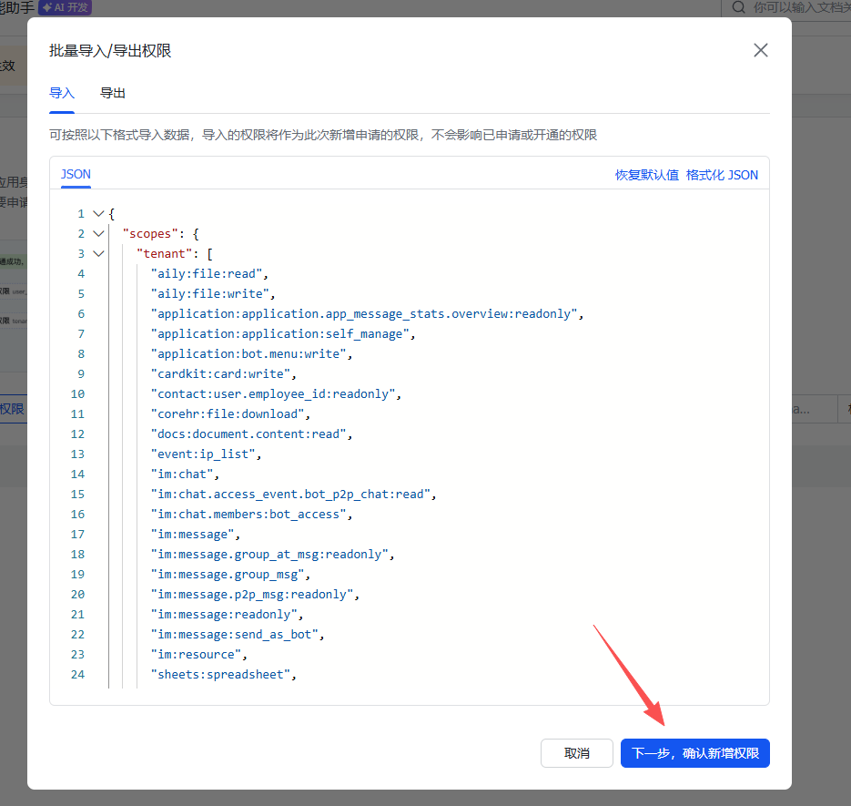 粘贴权限配置:将以下 JSON 内容完整复制到导入框中: