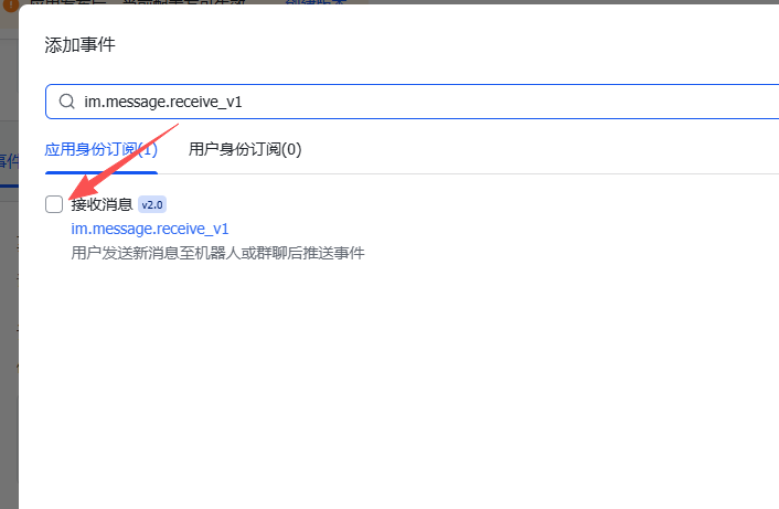 添加事件:至少需要订阅 im.message.receive_v1 (接收消息) 事件。