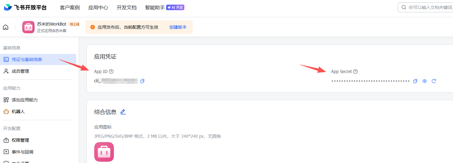 在飞书应用管理的 凭证与基础信息 页面,复制 App ID 和 App Secret。