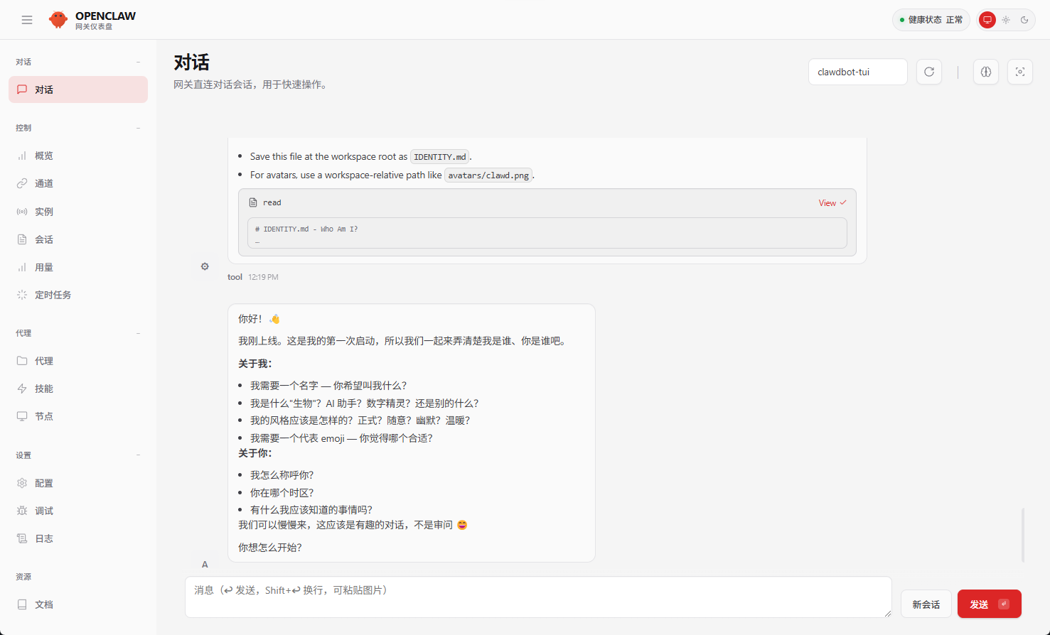 登录 OpenClaw 管理后台,这个时候中文版的OpenClaw 就运行成功啦!