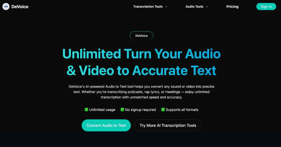 - AI音频转文本:使用先进的AI技术,快速准确地将音频文件转录成文本。 适用于播客、内容创作者和需要快速可靠转录的专业人士。 几分钟内完成转录,支持多种音频格式。