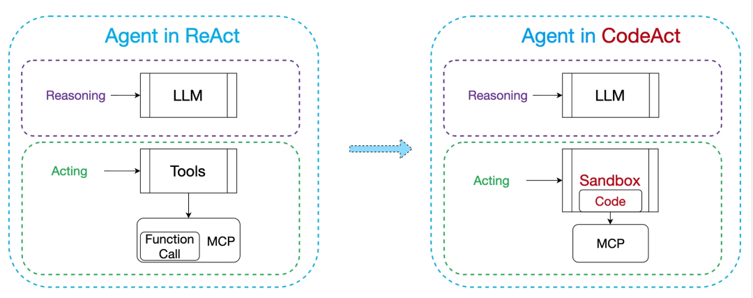 Manus 还提到“inspired by CodeAct”。CodeAct 来自 UIUC 王星尧博士团队(《Executable Code Actions Elicit Better LLM Agents》),主张以可执行代码统一行动空间:Function Call 与 MCP 只是方式之一,直接“写代码-执行”往往更有效。2025 年 11 月,Anthropic 发文提出把 MCP 服务器作为“代码 API”来暴露,Agent 通过写代码与 MCP 交互,按需加载、节省上下文,效率更高。这与“AI 的关键 affordance 是代码”的观点不谋而合。