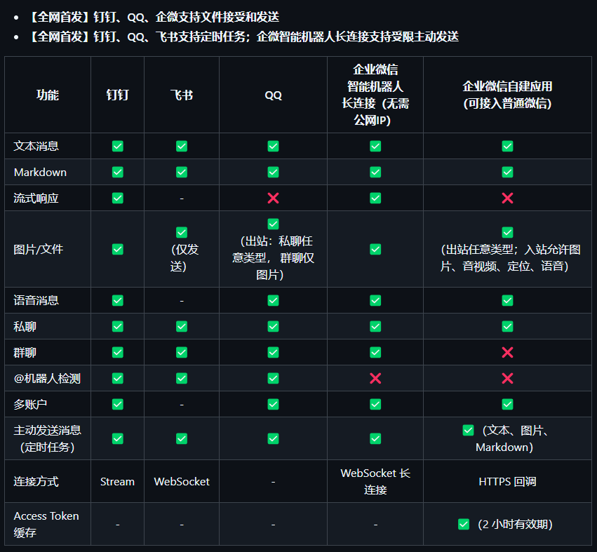 这不是重新造轮子,而是通过插件机制实现渠道扩展,让同一个 AI 助手实例能够同时服务于多个国内办公平台。