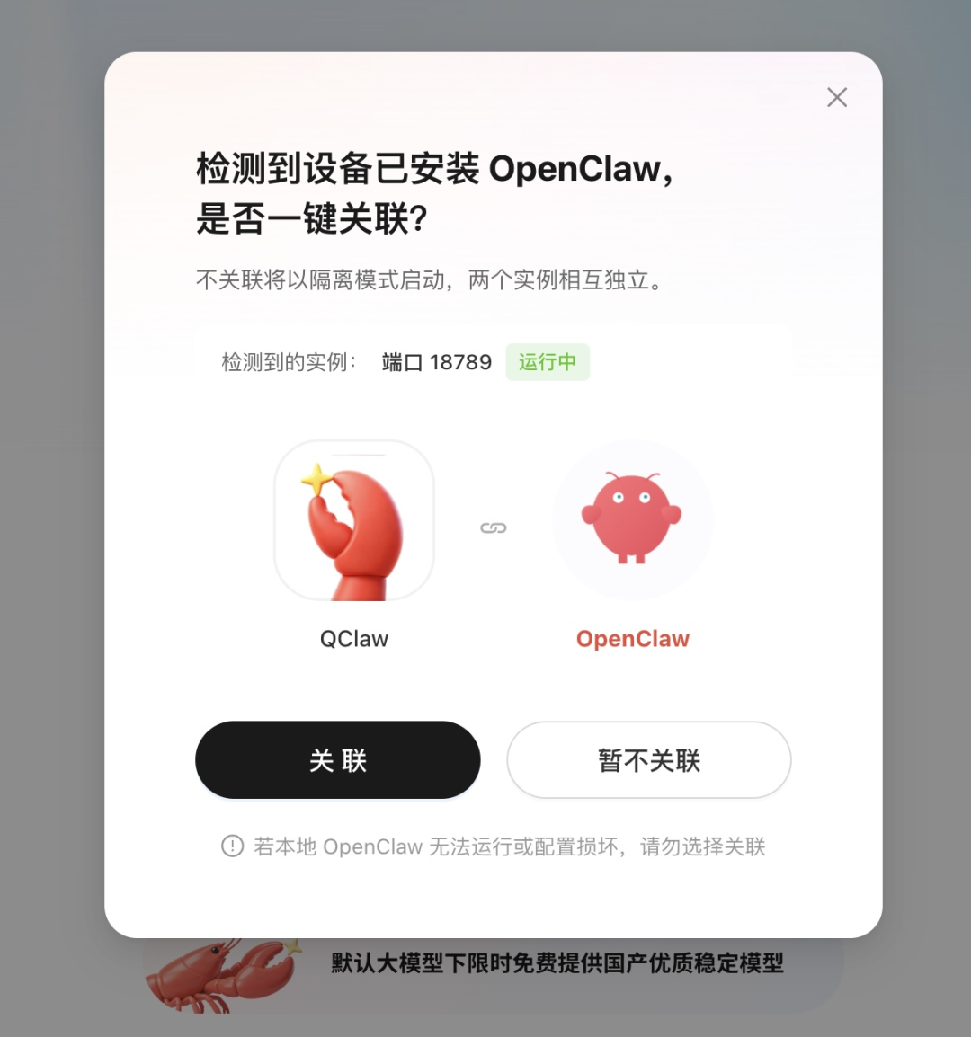 如果你的本地环境里之前已经安装过 OpenClaw,也可以直接一键关联,自动同步此前已有的信息,无需从头重新配置。