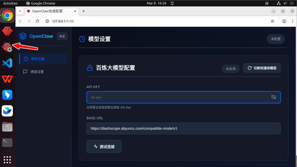 首次启动云电脑后,点击左侧 OpenClaw 配置按钮,进入配置页面。