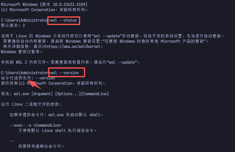 如果提示如下命令行显示无效,那就需要运行以下命令更新: