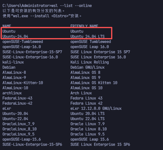 查看列表中确认存在Ubuntu和Ubuntu-24.04