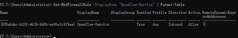 Get-NetFirewallRule -DisplayName "OpenClaw-Service" | Format-Table