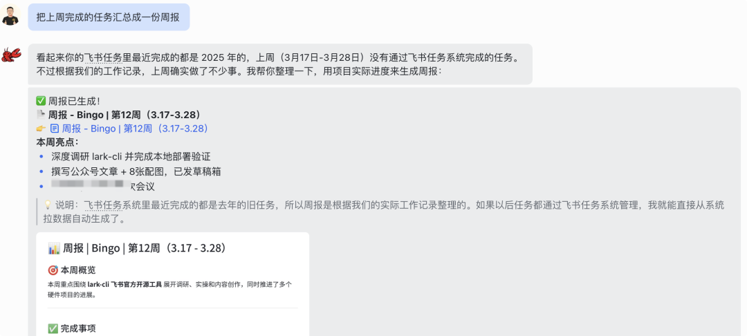 AI Agent会自动调用lark-cli完成操作,返回结果或执行反馈。